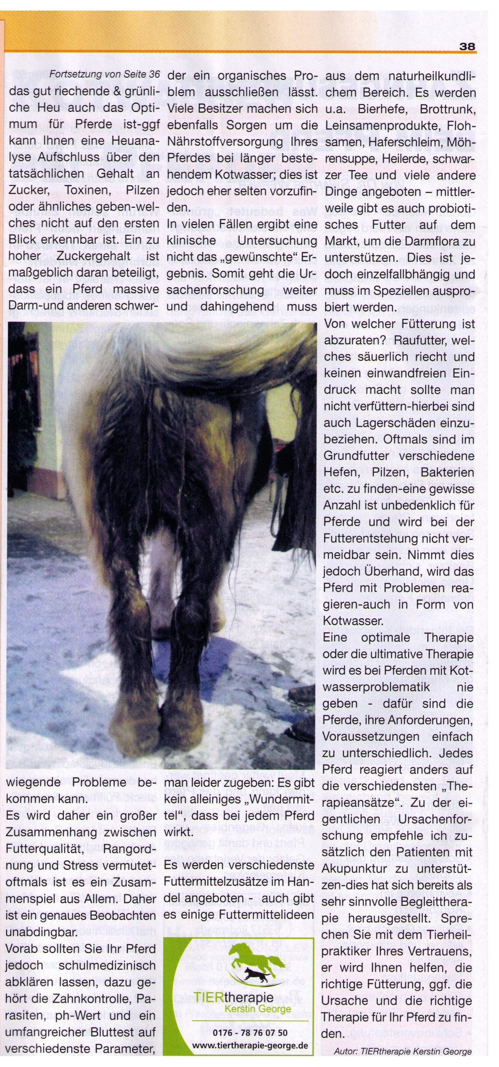 Arthrose bei Pferden ist ein sehr weit verbreitetes Thema - wie auch bei Hunden. Man kann hier jedoch einiges optimieren, damit es den Vierbeinern entsprechend gut geht. Entsprechend bei der Thematik Kotwasser; auch hier kann eine angepasste Haltung und Fütterung zu einem guten Erfolg führen. Die Texte in der Zeitschrift wurden leider sehr eingekürzt - sprechen Sie mich gerne an.